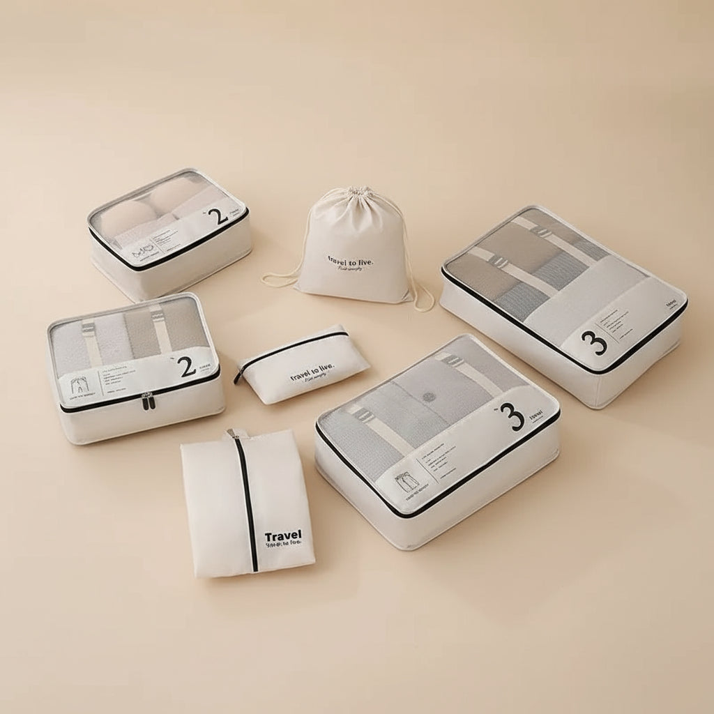 Travel Smart – 7-piece storage bag set. Stay organized and stylish on the go with this ultra-lightweight set made from breathable, waterproof polyester. For journeys that stay clear and stress-free.