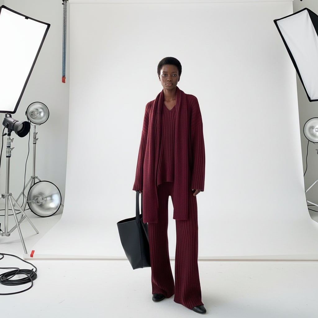 Chic & Cozy – your autumn statement. This elegant knit set in rich burgundy combines relaxed looseness with stylish warmth. The V-neck, wide-leg trousers, and matching scarf make it the perfect 3-piece ensemble for cool days.